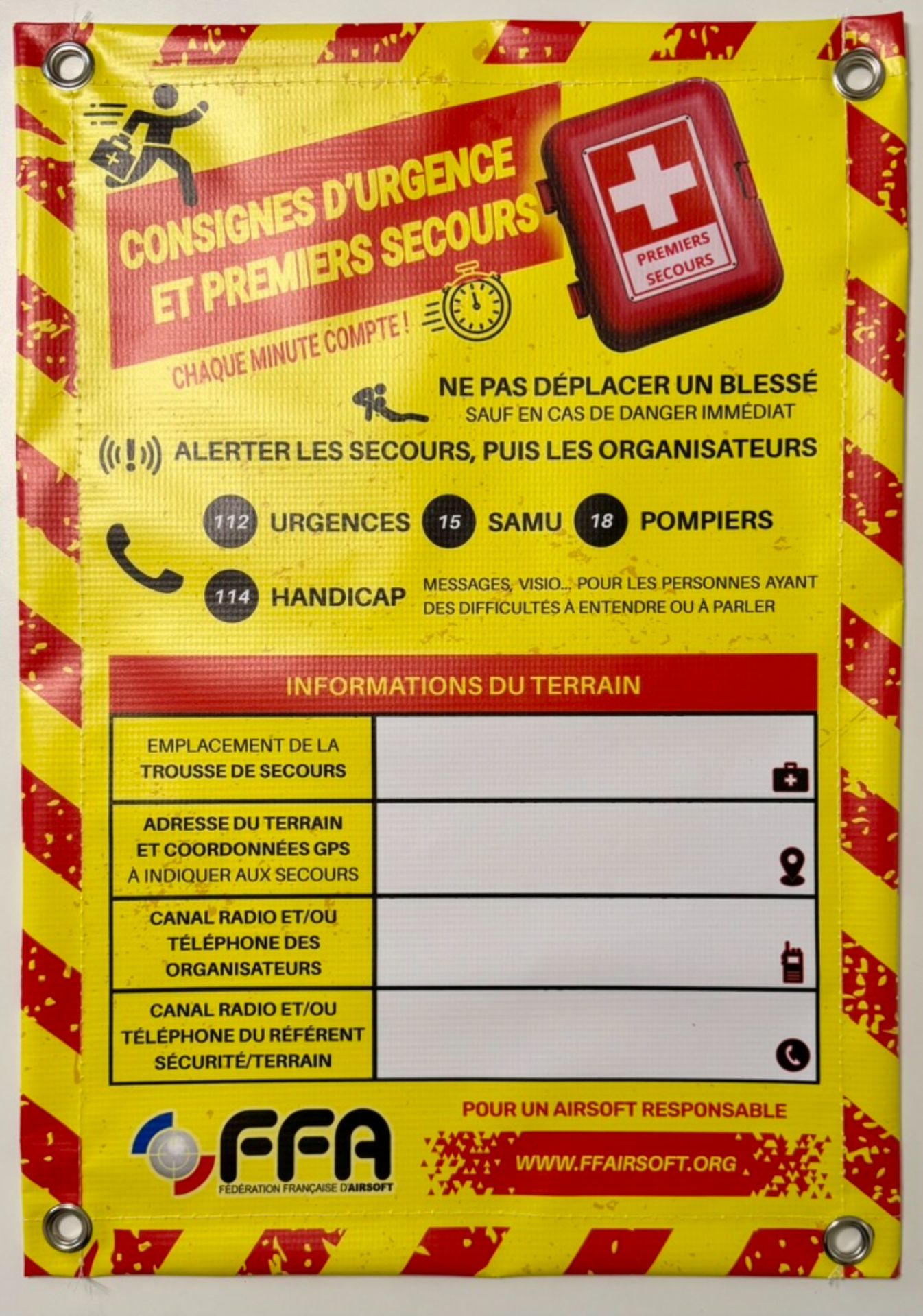 Signalétique Urgence et Premiers Secours : Cette signalétique à installer dans votre zone neutre, permet de centraliser les informations et numéros d’urgence en cas d’accident.